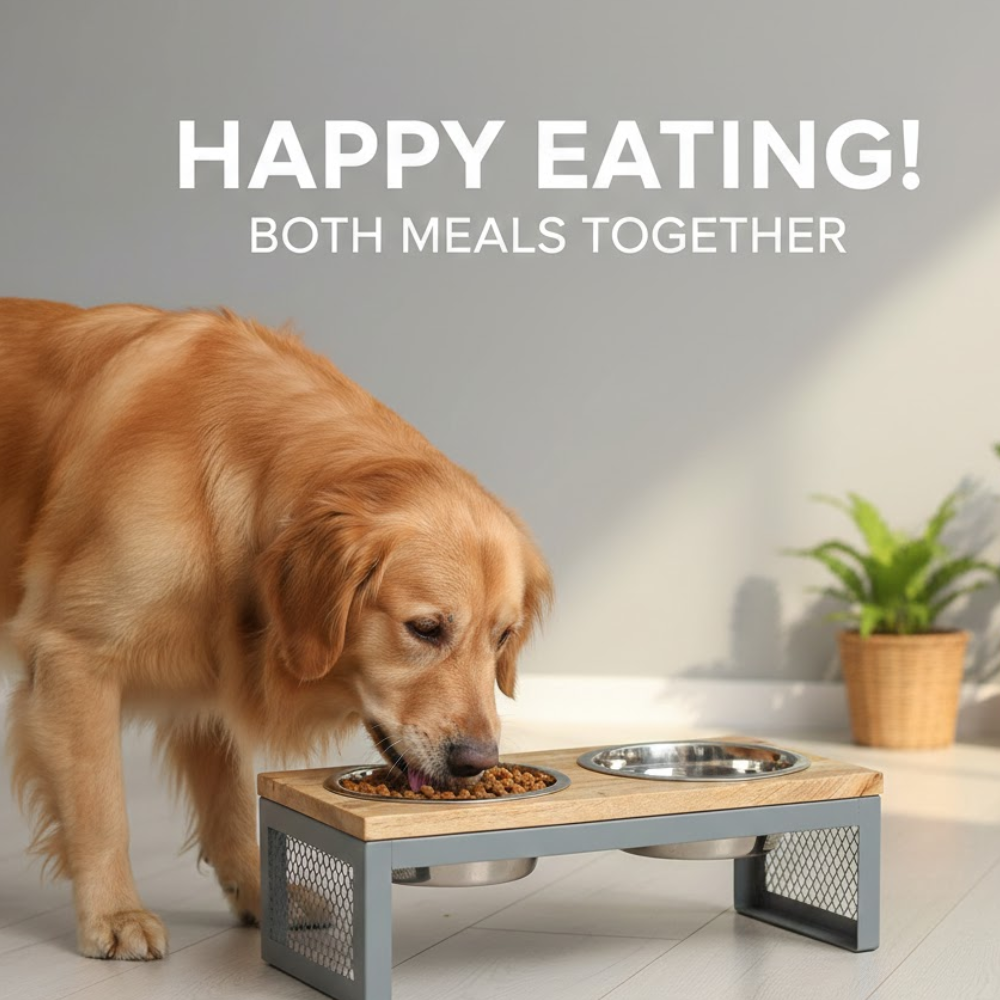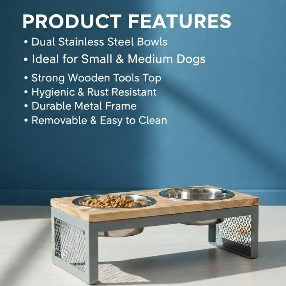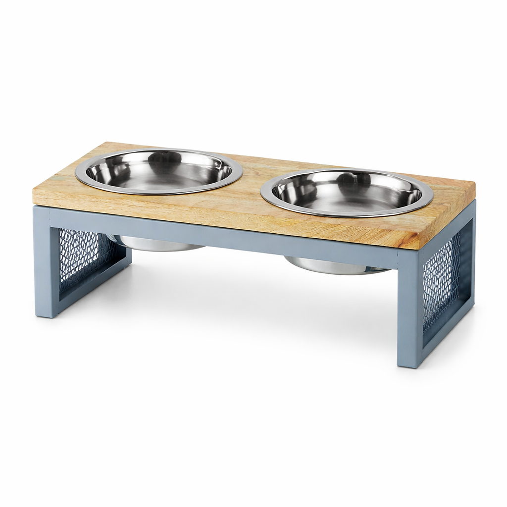 Our Wooden Top Mesh Diner with Stainless Steel Bowls is a marriage of form and function. The 5.5-inch elevation of the stand provides comfort and ease for your pet while eating their meals. It allows for small to medium-breed dogs to bend less, thereby helping their posture and digestion.