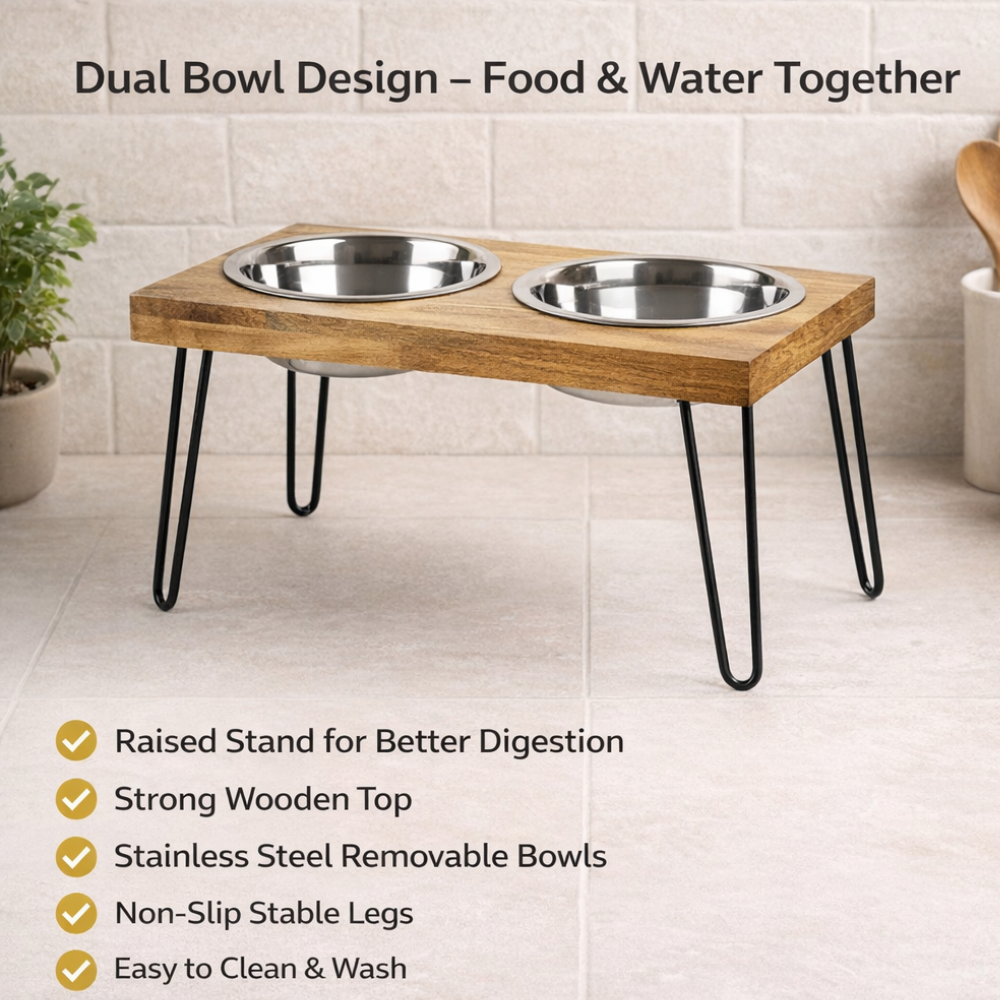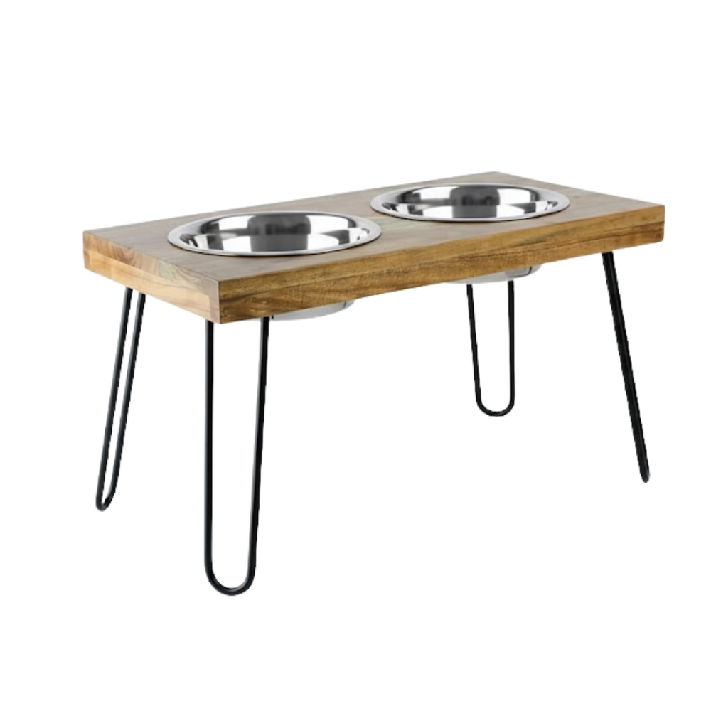 Our Raised Wooden Double Diner with Stainless Steel Bowls is a marriage of form and function. The 12.5 inches elevation of the stand provides comfort and ease for your pet while eating their meals.