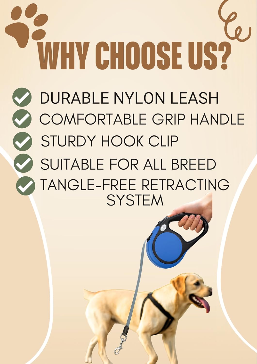 Tangle-Free Nylon Tape: Enjoy a hassle-free walk with a 5m-long nylon tape, providing ample space for exploration without the worry of tangles.