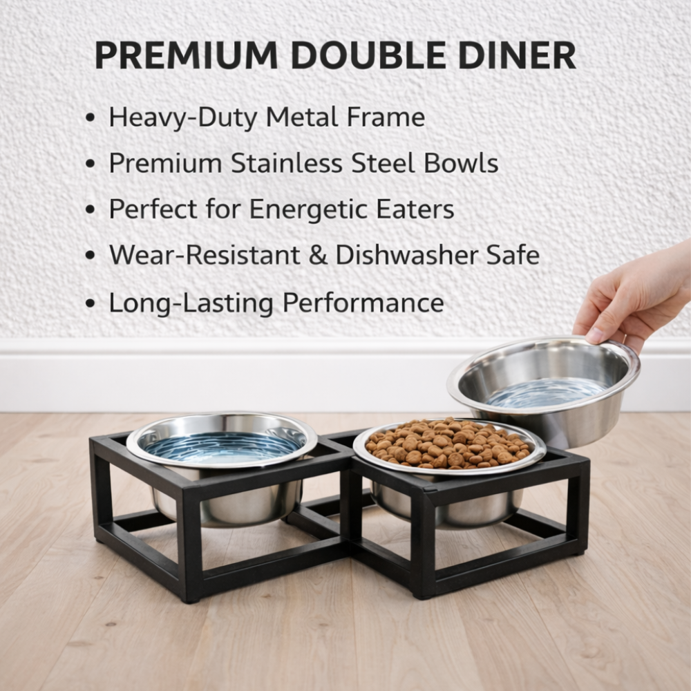 Pawpourri's newest durable 'Ruff & Tuff' stainless steel bowls with a premium finish and stand is going to be the perfect addition to your pets eating routine. This Elevated Metal Double Diner is designed to provide your dog with the perfect height to eat and drink comfortably. The bowls are removable, easy to clean and dishwasher safe.